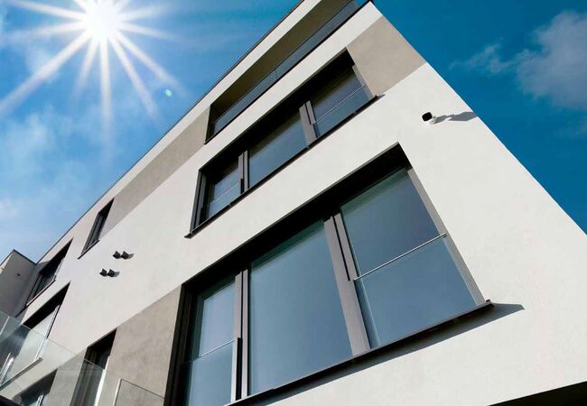 Als Festverglasung bietet GEALAN sehr große Kunststoff-Alu-Fenster an. In Höhe und Breite sind jeweils 350 cm möglich.