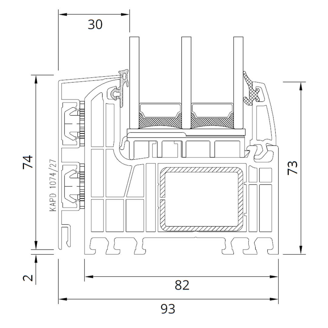 Dichtungssystem: 2 EPDM-Dichtungen (innen und außen) und eine zusätzliche zentrale Dichtung aus geschäumten EPDM